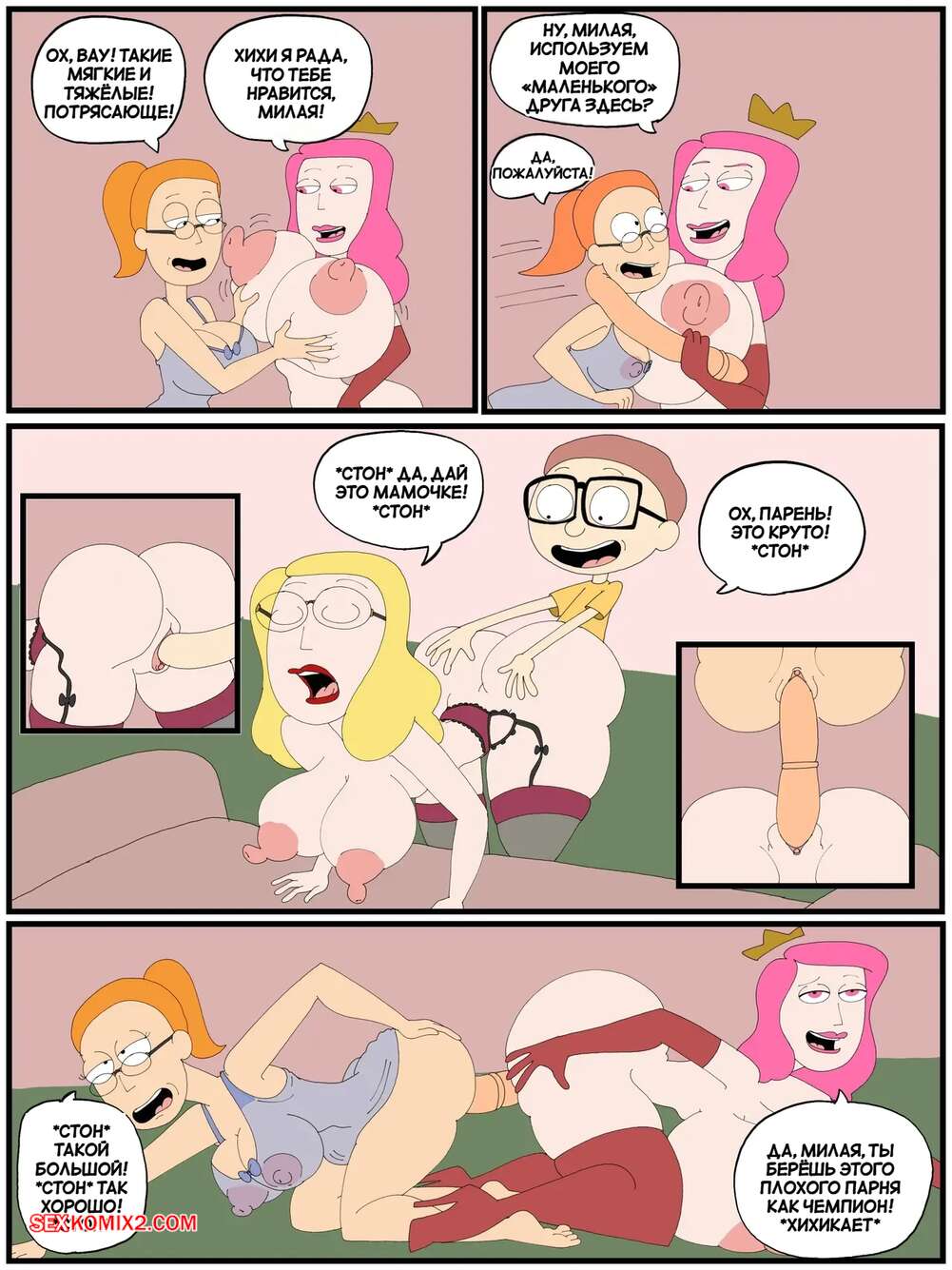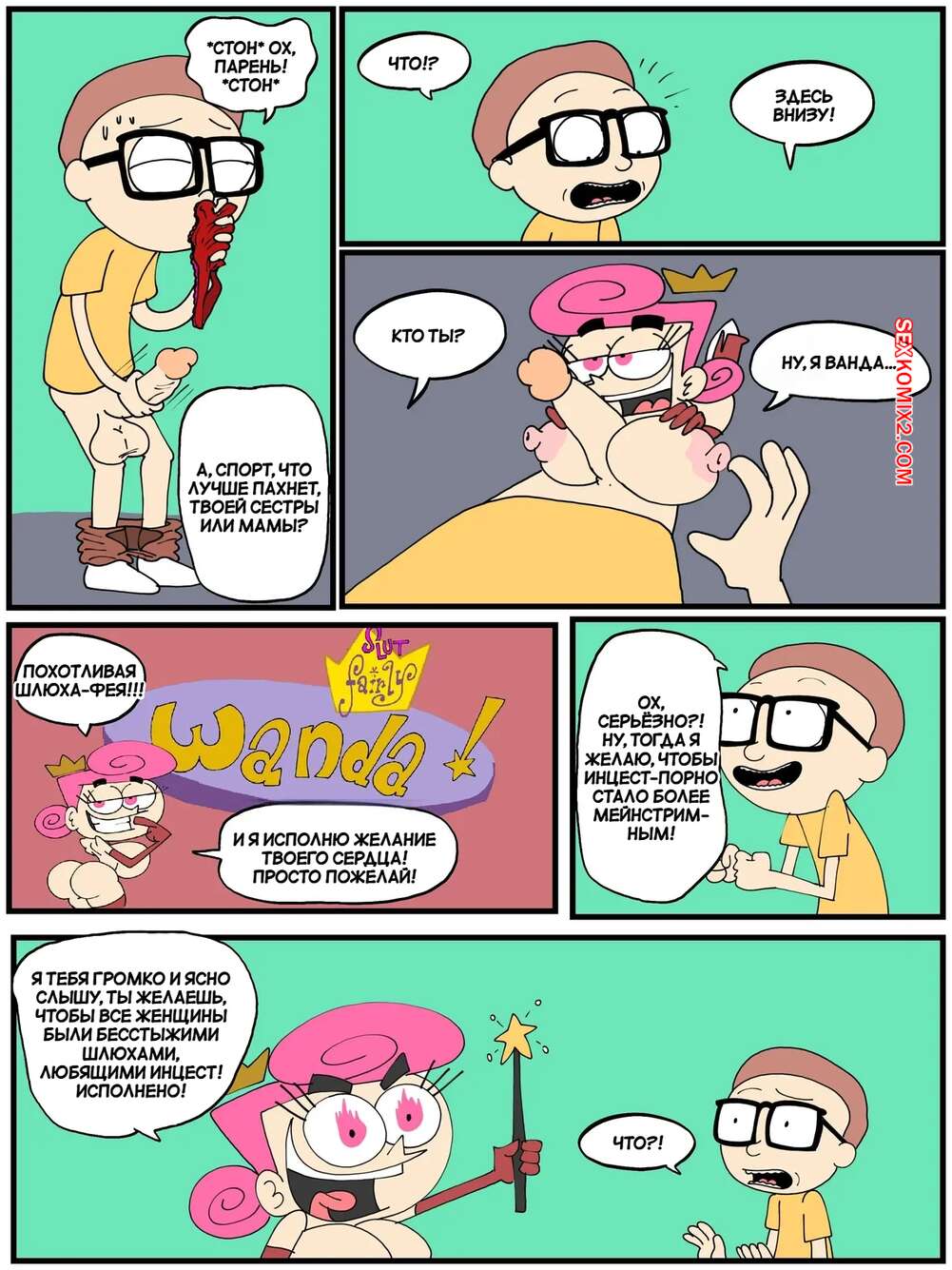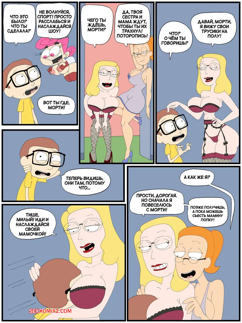 Порно комикс Ванда в мульти вселенной. Часть 6. Wanda Goes to the Multiverse. maxlat В комнату к Рику пришли его мамка и сестра в сексуальных нарядах, желающие насладитсья огромным членом. Красотки отсосали пареньку, после чего он по очереди их выебал.