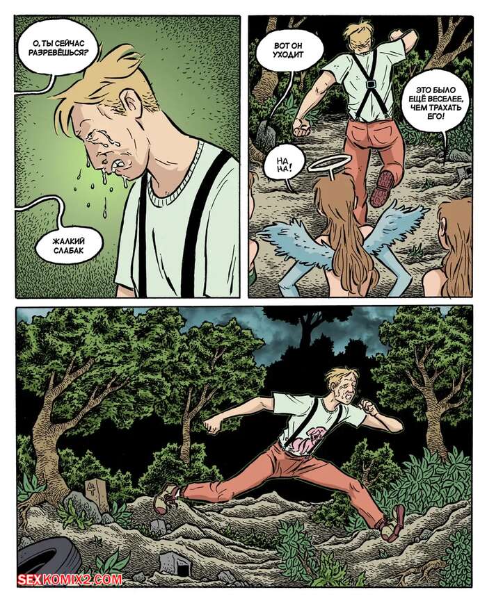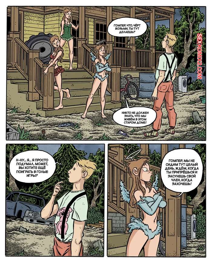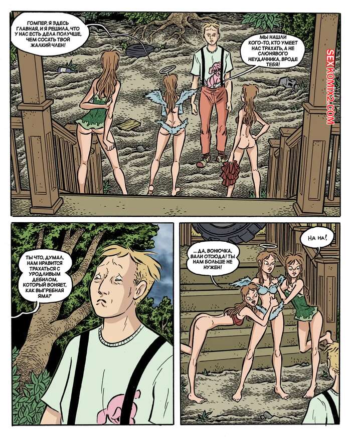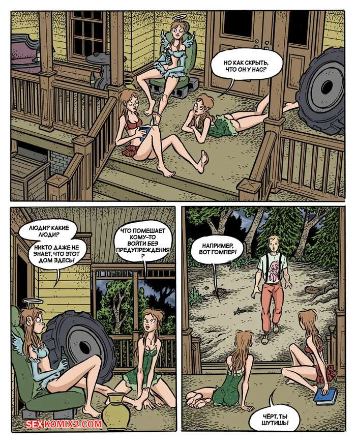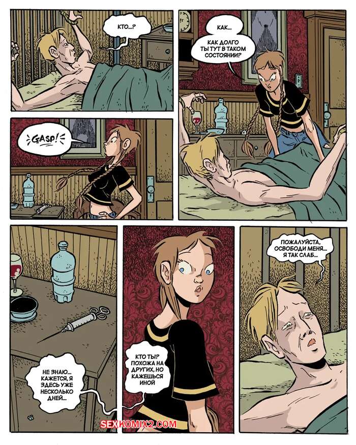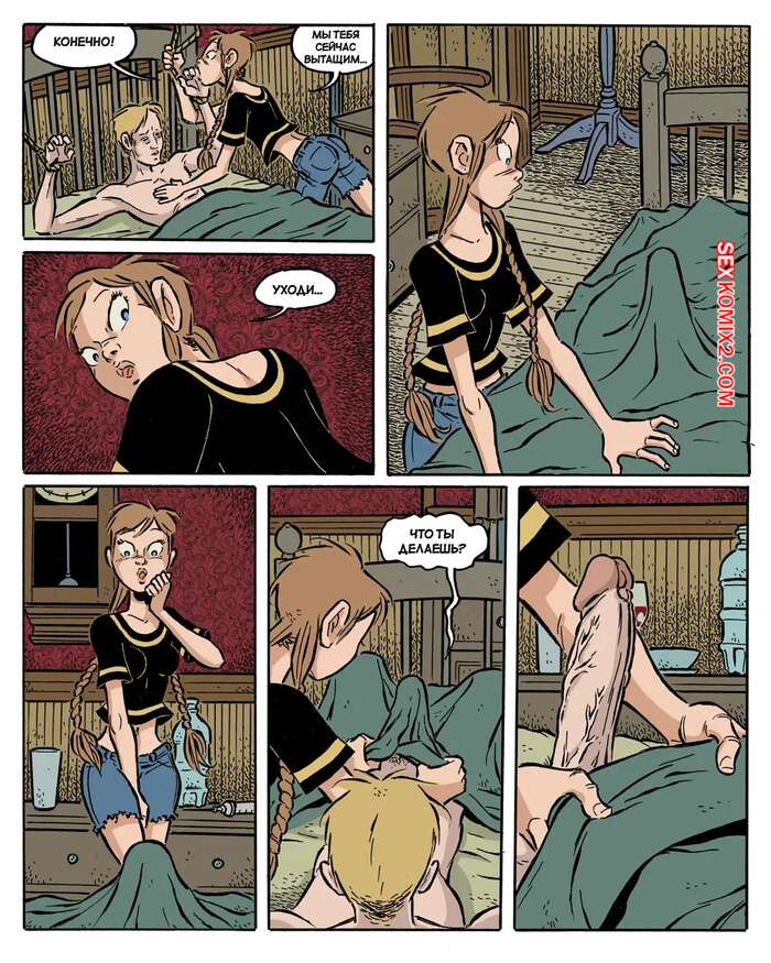 Порно комикс Сумерки. Часть 4. The Gloaming. Hans Rickheit Девушки связали у себя дома парня, который проходил мимо. Одна из сестренок отправилась к нему в комнату и стала сосать его твердый член, после чего села на него сверху и дала себя трахнуть.