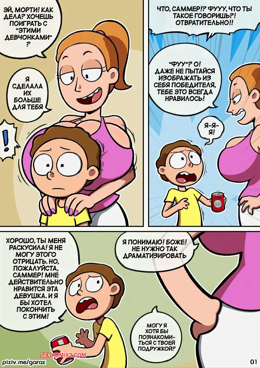 Порно комикс Рик и Морти. Саммер и Морти. Summer x Morty. Garabatoz. У горячей красотки Саммер увеличились сиськи и Морти не может пройти мимо сестренки. Он стягивает с нее трусики и трахает ее пизденку, после чего заполняет рыжую девушку спермой.