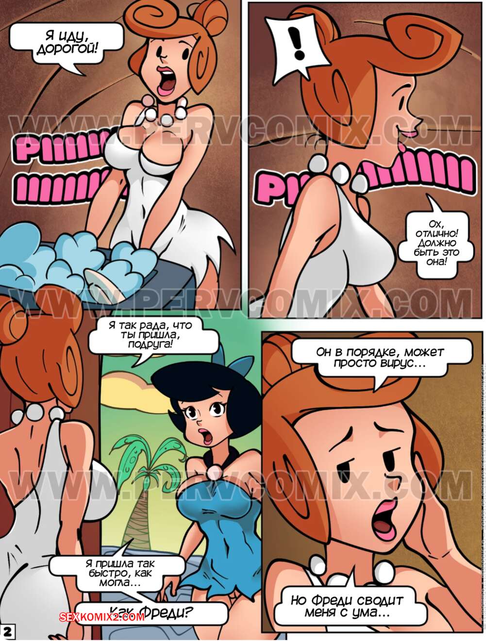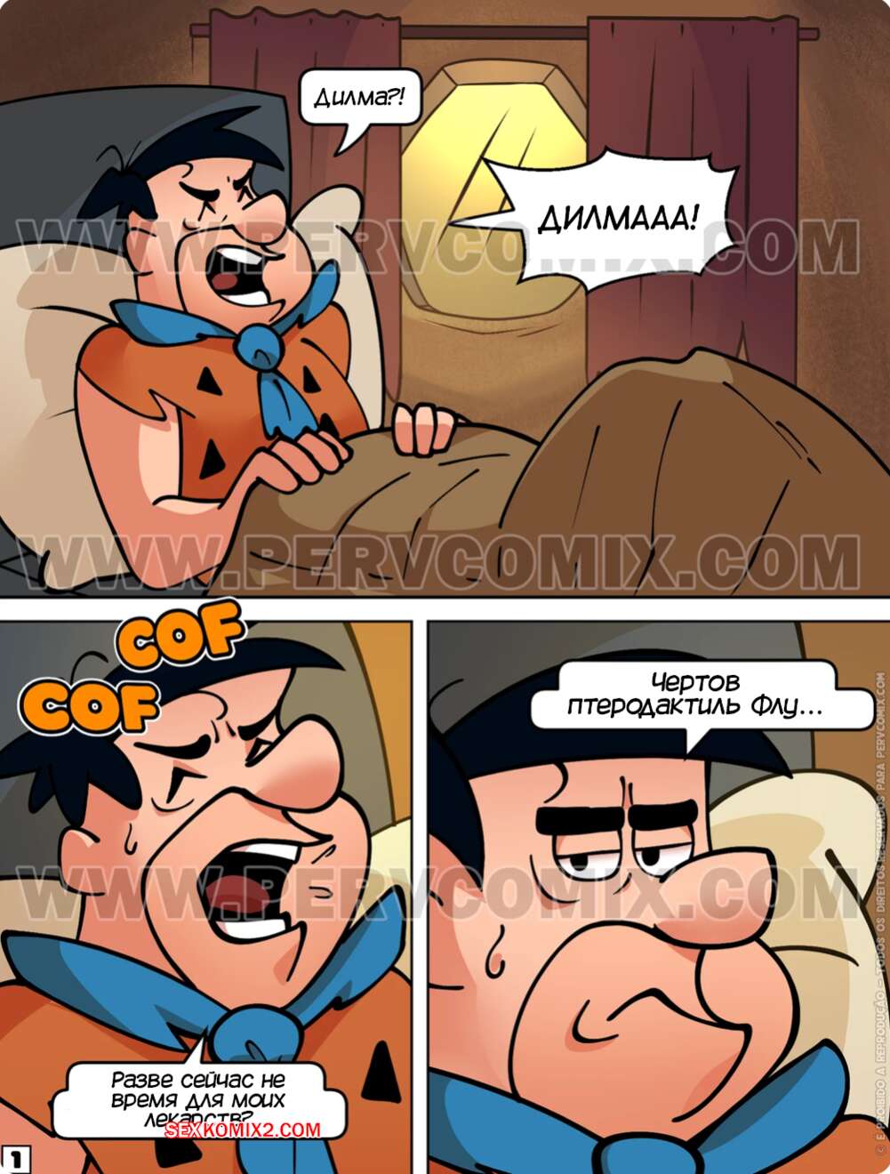 Порно комикс Флинстоуны. Часть 3. Os Pervstones. PervComix Фреди заболел и Дилма обратилась к подруге за помощью присмотреть за мужем. Бетинья пришла в комнату к соседу и была поражена его стояком. Она сперва отсосала его член, после чего дала выебать свою пизденку и кончить ей на лицо.