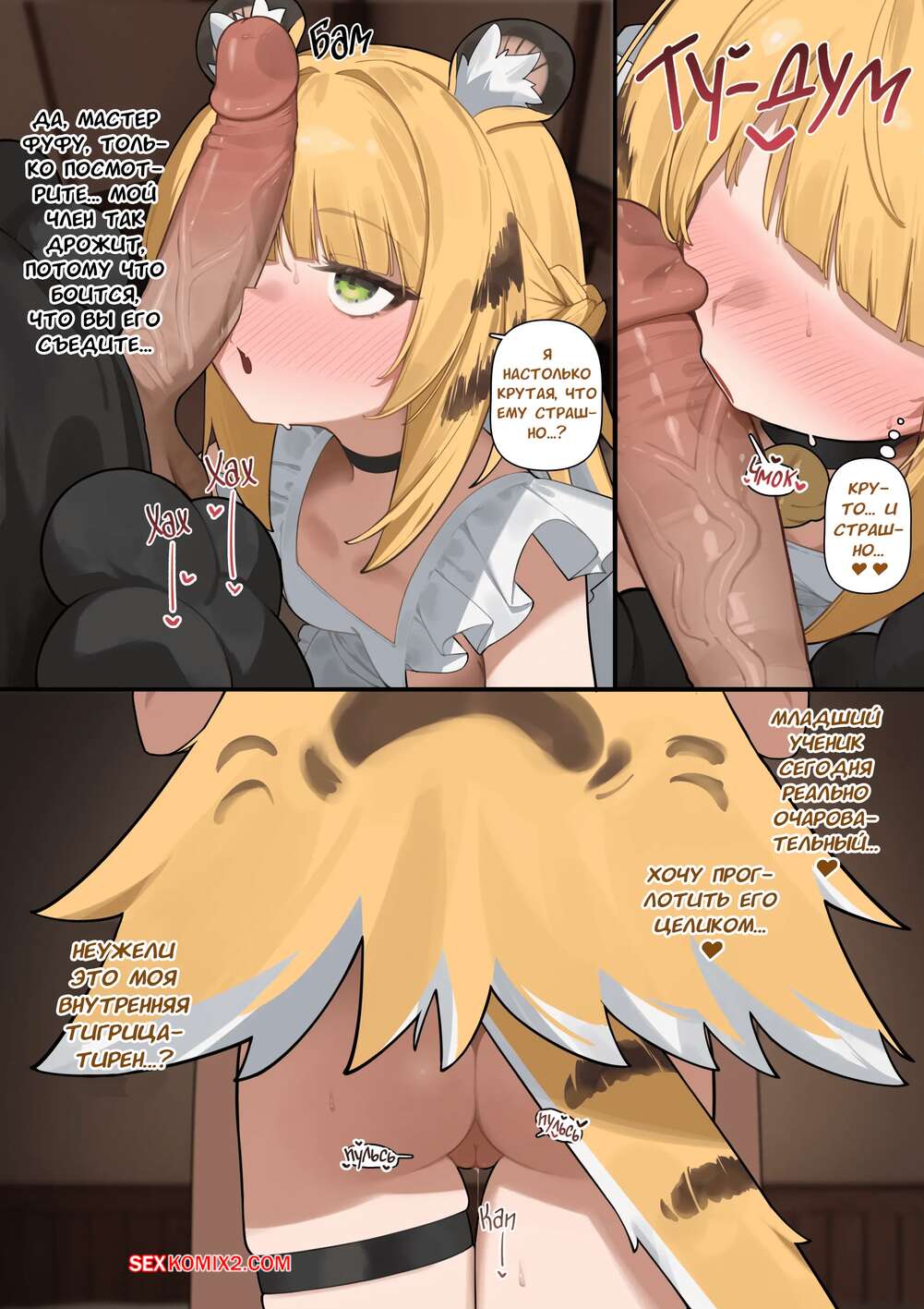 Порно комикс Zenless Zone Zero. Давайте поиграем, Мастер Фуфу. Flasso Парень решил повеселиться со своей ученицей. Он ставит девушку на колени и дает отсостаь свой член, после чего укладывает ее на стол и трахает ее пизденку твердым хуем.