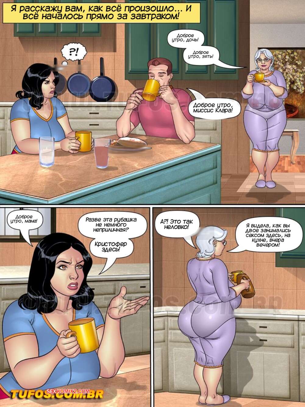 Порно комикс Папочка. Тесть извращенец. Часть 21. Tufos Кристофер узнал, что Клариса трахалась с его отцом ночью, пока он спал. Мужик собирался уйти из дома, но красотка просит простить ее и готова сделать все, что он пожелает.
